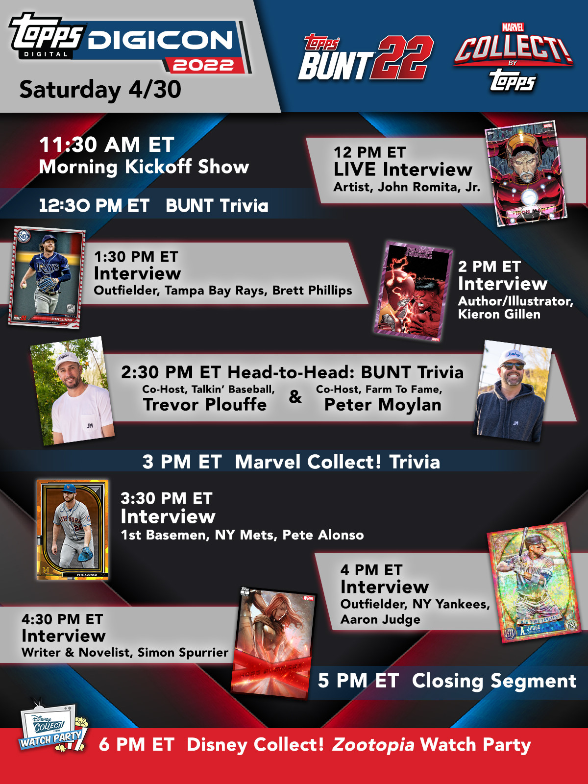 Saturday will bring a full day of interviews and all new content for Marvel Collect! and Topps BUNT, including interviews with MLB stars Pete Alonso, Aaron Judge, Brett Phillips and more!